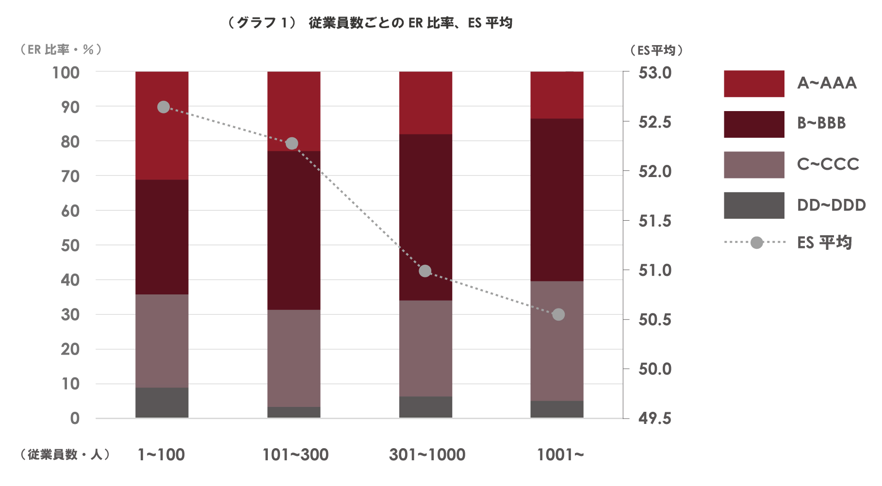 従業員数が1~100人、101~300人、301~1000人、1001人~の企業に分類し、各企業のES、ERの関係を(表1)、(グラフ1)に示す。(表1)、(グラフ1)の結果より、従業員数が多いほど、従業員エンゲージメントは低くなりやすいことがわかる。特に、ERがA~AAAの企業の比率は、従業員数が多いほど低くなっている。