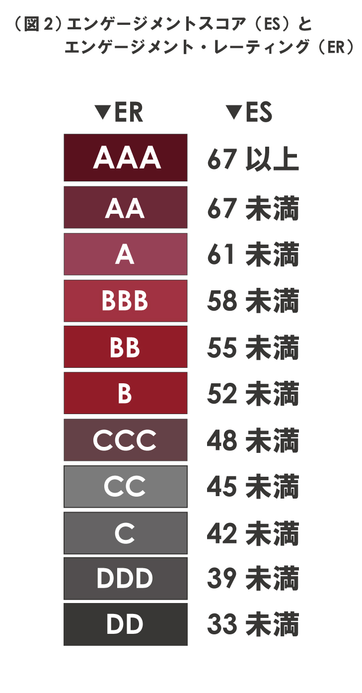 (※1)社会心理学を背景に、人が組織に帰属する要因をエンゲージメントファクターとして16領域に分類し(図1) 、従業員が会社に「何をどの程度期待しているのか(=期待度)」、「何にどの程度満足しているのか(=満足度)」の2つの観点で質問を行うサーベイ。エンゲージメントファクターにはそれぞれ4つ、計64の項目が設定されており、回答者はそれぞれの期待度、満足度を5段階で回答する。その回答結果から「従業員エンゲージメントの偏差値」であるエンゲージメントスコア(以下ES)を算出し、エンゲージメント・レーティング(ER)として整理している。 (図2)