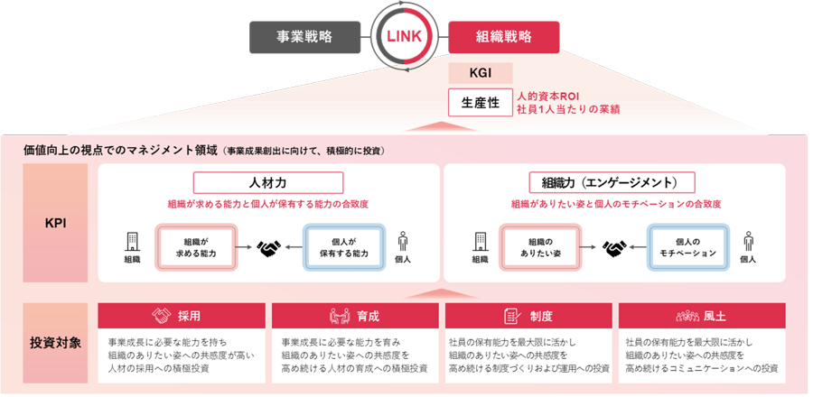 当社グループのビジネスはソフトビジネスであり、人的資本がさまざまな資本の価値創造の源泉であると考えております。そのため、顧客価値を最大化する事業戦略と人的資本価値を最大化する組織戦略を対等に捉え、双方をリンクさせながら経営をしております。組織戦略においては、採用・育成・制度・風土への投資を通じて、人材力と組織力(エンゲージメント)を高め、人的資本投資のリターンを示す生産性を最大化させることに注力しています。